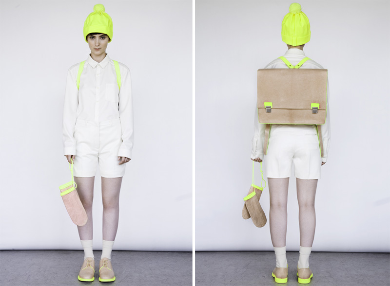 For her second collection Alba Prat got inspired by the cold war children going to school with their leather bags and knitted accessories handmade by their grandmothers. She sent us her ‘Neon Old School’ lookbook, where disciplined pupils are represented in three different outfits, in which the bright and strong spirit of their childhood is spreading around through the neon color.