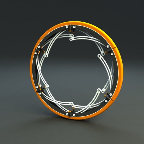 this allows the wheel to fold and become smaller, the spokes are contained in the inner structure of the wheel, when you unfold the system, the spokes rotate to the center of the mechanism where it attach to the center of the wheel. The double triangle structure is composed by expandable modules, each one collapses to a smaller dimension and then this modules align by the rotation of the axis in the joint of the structure, to keep in position all the structure is used an special part in a form of an X that aligns all the modules to their position.