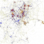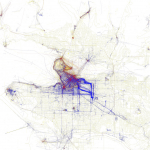 I came across these maps and was immediately drawn in. I had no idea what the maps were illustrating but their appearance was captivating enough to make me do a little additional research to find out. Photographer and digital cartographer Eric Fischer created maps of 50 cities for which he used the geotags of photos uploaded to Flickr and Picasa to plot out every photograph taken on a street map. He divided the photographers into three camps: