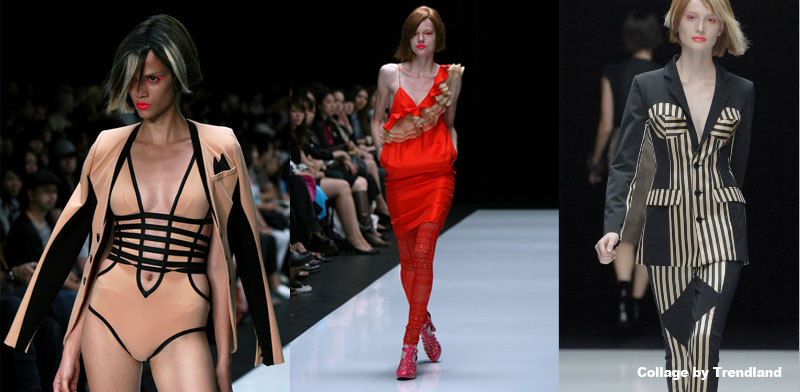 This collection represents graphics by constructing three dimensional effects with patterns and cutting. Three dimensional effects are emphasized with details such as lace up, zipper or piping and sheer or stretch material to enhance the woman’s body line. Also by adding “banded” or tribal accessories, MUG proficiently expresses the strong and fleeting image of woman.