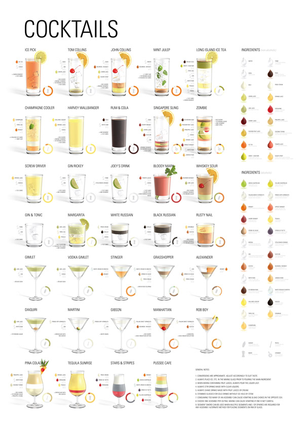 Last February we introduced you to the Cocktail posters of Brazilian graphic designer Fabio Rex, here is a similar project by German student Konstantin Datz. With beautiful infographics he illustrates the ultimate collection of the 35 most common cocktails, also available as a poster. They also created an awesome iPhone app available for $1.99 on iTunes – Cocktail lovers will enjoy this a lot!