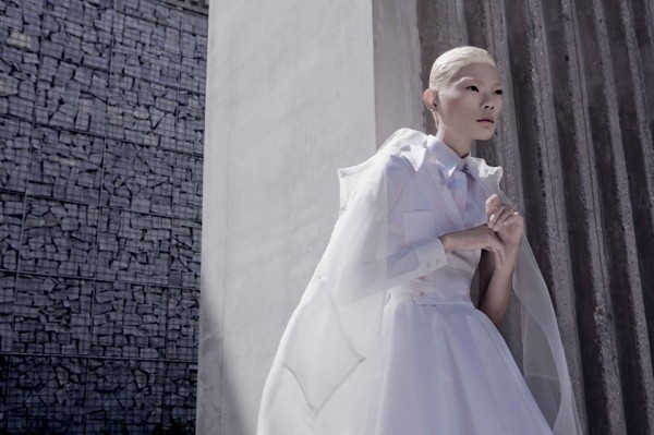 The young fresh designer brings us a stunningly fresh answer to his question, “How many ways can you re-imagine a white shirt?” He has tweaked his white shirt creations what with combining cotton and organza, varied drapery and structure, unexpected cuts and folds, perfect pressing and pleating, and toying with proportion and symmetry. Max.Tan makes it clear that the aforementioned wardrobe staple can indeed be worn with unique flair.