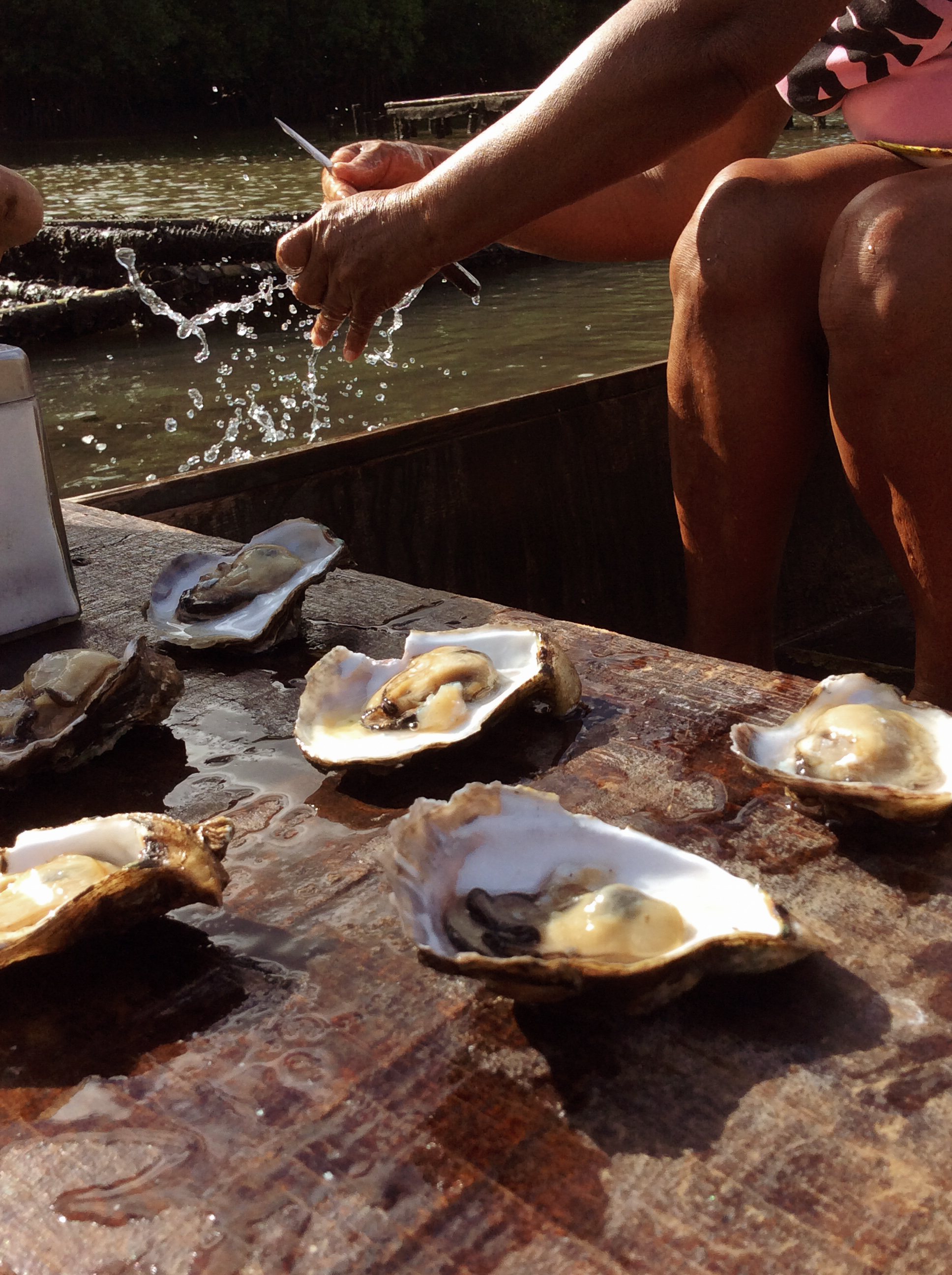Dona handed me an ice-cold bottle of champagne to wash down the oysters before cleaning another bunch of about six more to try. This time she paired the bunch with her unique red honey from special blossom bees unique to these mangroves. It was amazing to taste such large, succulent oysters with honey, something I had never tried before. She carefully prepared one for me drizzling it generously with the red honey. “This honey is full of healing properties” – she said. The flavor was like a red berry infused honey but woodier, very fragrant, and paired with the less salty oyster was a balanced perfect taste – sweet and smokish natural bliss. We threw the shells back in the water so other oysters could grow from them, keeping the cycle abundant.