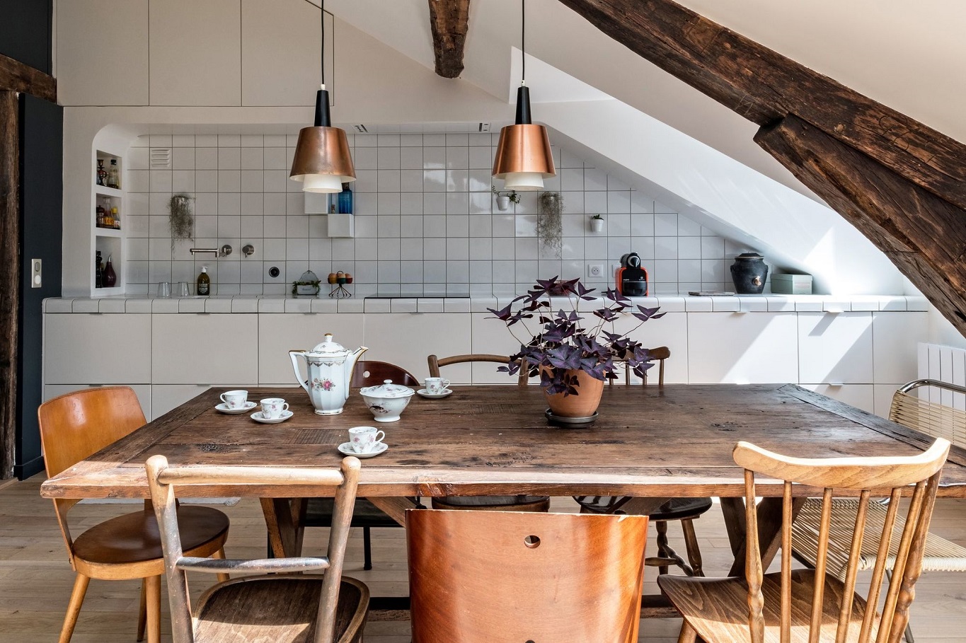 A previously dark attic apartment with a low ceiling, only 2 small skylights and a outdated interior, French architect Mélanie Gonin saw the potential of the space and transformed it into a stunning light-filled home while keeping all the original bones of the building, giving the space a brand new character.