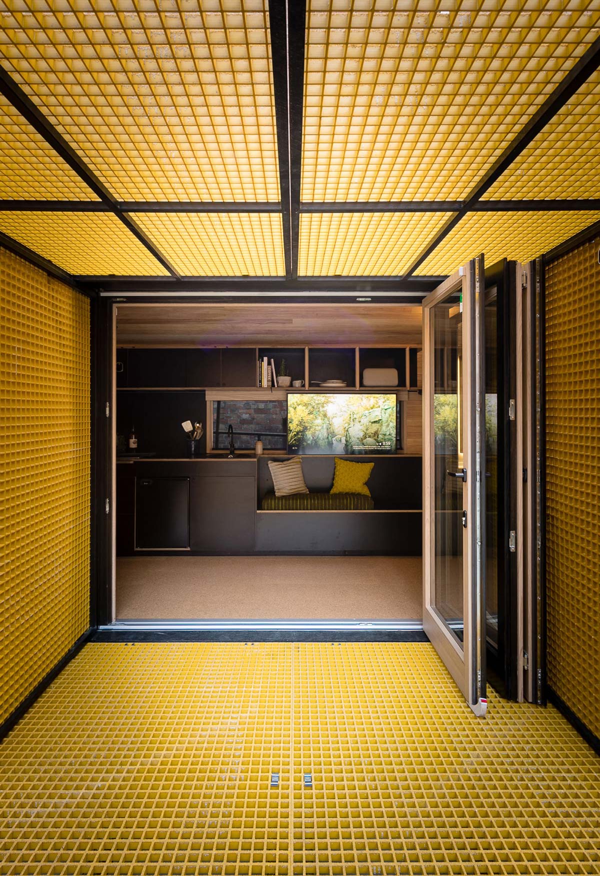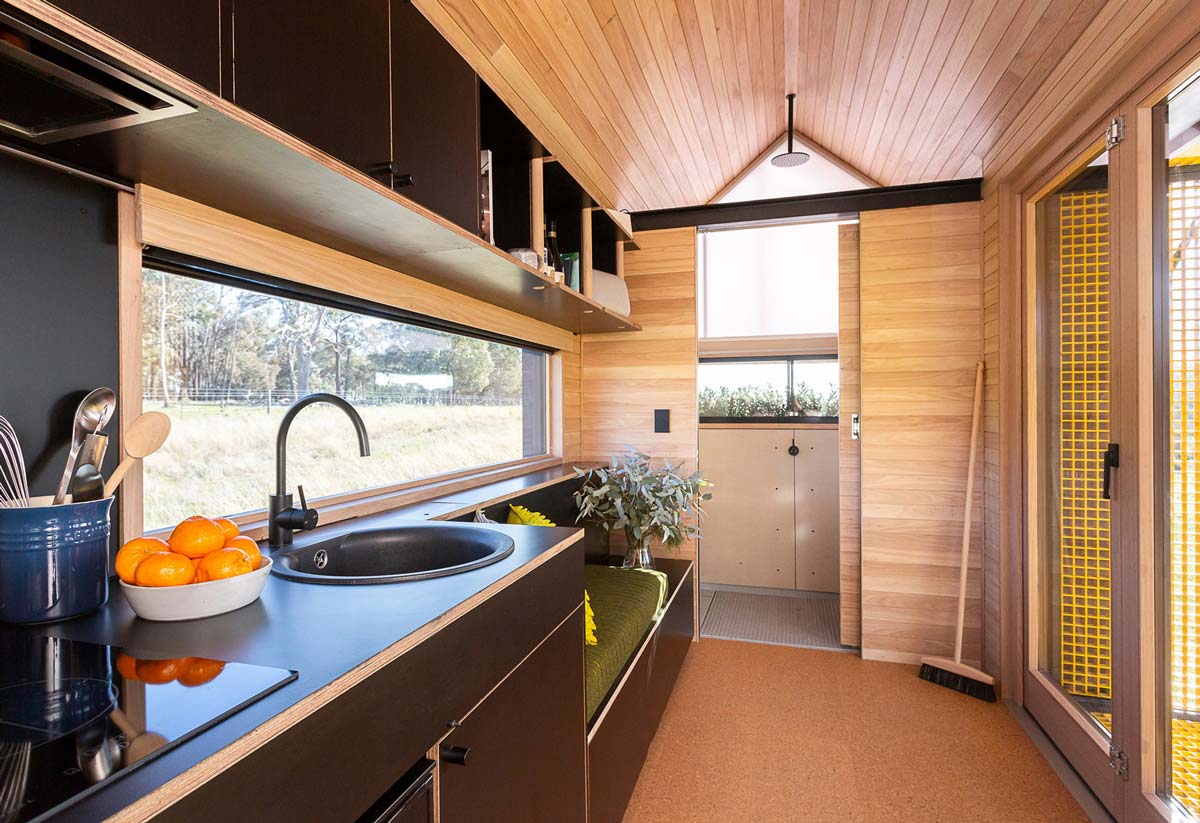 Internally the tiny house comprises one main room including kitchen, living and sleeping spaces with a separate compartment for the bathroom.